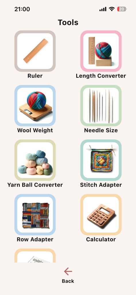 The Tools section gives you quick knitting utilities without leaving your app workflow.