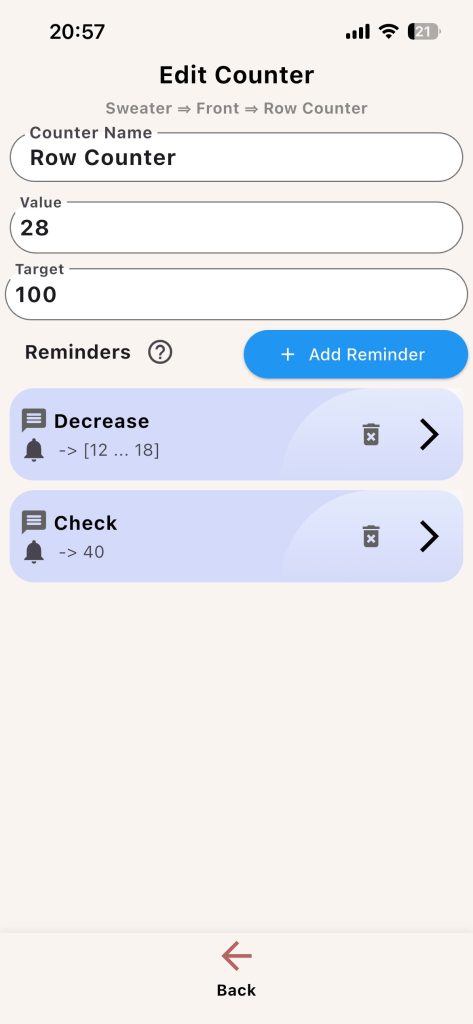 Example: For a lace repeat every 12 rows, create a secondary counter named Lace Repeat, set reset-after-row to 12, and link it to the main Row counter if you want automatic movement.
