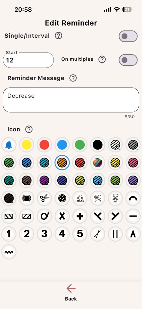 Example: If a pattern says “decrease every 6th row,” set Single mode with Start = 6 and enable On multiples. Your Row counter will trigger reminders at 6, 12, 18, and so on.